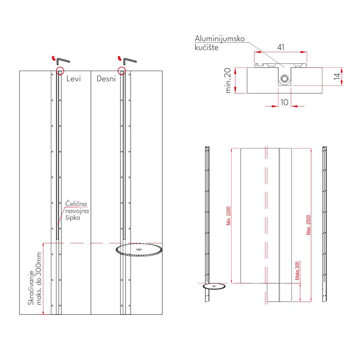 Aluminijumski poklopac može se skratiti najviše 300mm u donjem delu zatezača.
